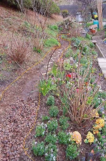 珍しく、二度目の更新です。 一度目の更新は後で消します。私のブログらしくないからね。 ただ、皆さんの嬉しい書き込みは・・プリントして大切に残しておきます。 グズグズな私を励ましてくださってありがとうございましたオバチャンは嬉しくて、グググッときています。 みなさんがおっしゃるように・・・悪意のあるコメントは無視します。 そして、また悪質な書き込みがあったら、又、削除して・・・前に進みますね。 そーだ、そーだ、それが良いと言いました!! はい、では・・・いつもの花ブログに切り替えます。 さて、日曜日の戦利品 好みの色ではない あでやかな色もありましたので、後ろの殺風景な土手に植える事にしました。一日・・土手の草むしり・・開墾 腐葉土を混ぜ込み花を植えようと思ったらいくらでも植える場所はあります。自分の土地ではありません・・宅地造成で出来た 余剰地 花壇の上のほうは通路にしました。タイルでも敷こうかな。 あれだけあった苗も・・植えてみると、こんなもんです。 右のほうの大きい株は・・こぼれダネから育ったポリジ バラ咲きのジュリアン・・派手な色 真ん中はアジサイその周りを囲むように、ネメシアを植えました。 この土手に今、ふきのとうがいっぱい出来てるんだけど・・もう 開き過ぎですかね・・まだ一度も料理した事がありません。 グランドカバーに・・ラミウム?を植えています。広がってくれるといいな。 しばらく、曇天が続きそうですね。冬季オリンピックは終わったし・・・ 毎日テレビ観戦しながら・・・ここ2週間ほど、 オープンガーデンクラブの会報誌を作るのに悪戦苦闘しておりました。会員のみなさん・・・届きましたでしょうか? 小さなクラブですけど・・・みんなで、庭めぐりをしたり・・寄せ植え教室で遊んだり・・ハープ教室もね。ちょっと遠くへ・・素敵なお庭のペンションに泊まってガーデニングツアーに出かけようかと・・ 昨年、ブログで長野で素敵な所はないですか? って聞いたでしょ・・・教えて下さった方、ありがとうございます。 おかげさまで素敵なツアーになりそうですよ。 花ブログって、本当にいいですね。これからも頑張りますので、よろしくおねがいしまーーす♪ 下のバナーを押すとね、他のブログも見れますよ。素敵なガーデンがいっぱいですよ。・・・私のランクも上がるし・・・ウシシ いつもありがとうございまーーす♪