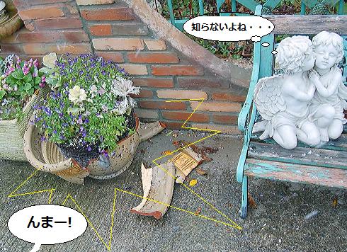 久しぶりに今朝は冷え込みました。庭のチェックをしていたら・・・・なんとーーーー!競り市で落札した・・・寄せ植えの鉢が・・見事にパッカリ!競り市の割りに高かったのに~。 そうか・・・今朝は寒かったもんね・・・。寒いと・・鉢が割れるって・・・聞いた事があるよ。 でも・・いくら寒くても・・霜も降りてないし、氷も張っていない よくよく・・・調べたら・・おかしい・・怪しい・・・ おまいさんだね~~・・・・・・知らない、知らない、知らない・・・ ウソをつくんじゃない!! 唯我独尊7さんからの画像です。問い詰めたら・・・開き直った!こんな所に鉢を置くのが悪い!!車をバックする時に横に寄りすぎたらしい 横幅3メートルの場所を車でバックするのに・・・鉢をカスる方が難しいと思うけど年をとったら・・謝る事を忘れてしまったようだ ・・・・ ま、いいけどさ、 午後から水っぽい雪が・・(早く言えば、みぞれダネ) 先日作った・・寄せ植えの上にも・・・ 美味しそうなシャーベットに見えます キッチンの窓から土手を望む・・・吹雪いています。 こんな日は・・ガーデニングはあきらめて・・ゆっくりとコーヒータイム以前はコーヒーメーカーでコーヒーを入れていたけど、今はドリップパックばかり・・こちらのほうがいつでも香りの良いコーヒーが飲めます。 それに・・このT-faLの湯沸しポットがエコで便利一人分の水を入れてボタンをポン!すぐに沸いて自動的に電源が切れる 以前はなんと無駄な電気を消費していた事か、すぐに使わなくても常に保温湯沸しポットには熱々のお湯が入っていて時々・・水を足さないと・・減っていて・・・・何も考えてなかったな。 みなさん、エコ、エコよ~~! エコを心がけましょーー!夜中まで電気を明々とつけて、パソコンで遊んでるアンタが言うな!! って、だれか言いました ? 下のバナーを押すとね、他のブログも見れます素敵なガーデンがいっぱいですよ。 いつもありがとうございまーーす♪