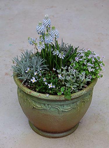 寄せ植えを4鉢作りました。 今日は2鉢だけアップします。残りはピンボケだったから・・ ブリキの赤が可愛いから・・あわせる花が難しい・・ ムスカリの色を引き立てるために・・シックにしました。 ムスカリ オーシャンマジック 見れば見るほど・・・可愛いムスカリです。 多肉(100均)コーナー 100均のウッドボックス 今日、モコの散歩に行って、春を見つけました。モコはモグラの穴を見つけたようです。後ろに居たら・・・土を思いっきり、かけられました。 花屋さんのブルーの小花たち 右下のイオノプシディウムは一度植えておくと・・・次の年からアチコチに出てきますよ。シンバラリアも・・・翌年から雑草並みに出てきます。 グランドカバーにいいですよ。 みなさんの書き込みと応援がとっても嬉しいです。ポチポチっとな、♪ いつもありがとうございまーーす♪