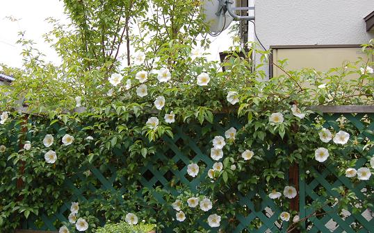今日は日中、暑いくらいの陽気で夕方温度計を見たら 26度だった!! ダロ、ダロ! ・・・なんだか、今日一日で、色んな植物が一気に大きくなったり、 花が開き始めたり・・モッコウバラも・・チラホラ 咲き始めたよ。 下の画像は・・・庭の一番奥、ティーコーナー、向こうはお隣です。そのお隣との境界から20センチ離れた場所にラティスを建て、ナニワイバラを絡ませてるけど、 生育が旺盛で、年に三度ほどカットしてお隣側の伸びた分は、特に気を使って、度々カットしています。それでも、沢山の蕾がついていたので、今年は見事な生垣になるかもね。ここから左のほうにズズーーーッと行くとモコの小屋がありますが、 ナニワイバラの枝が暴れまくって、・・通れないくらいでした。とにかく、トゲが凄いの! 服が引っかかったら、動けなくなる位。いつか買っておいた・・鉄の格子を小屋根からラティスにかけトゲで傷だらけになりながら、暴れていた枝を絡ませました。 部屋の中から見たところ・・・この部屋は夏になると、朝早くから・・日差しが射しこんで暑かったので、ナニワイバラの・・緑のカーテンでさえぎってくれるかもね~~。 そして、 家の反対側・・・ガレージの横は・・フェンスに・・ポールズヒマラヤンムスクが・・昨年よりも・・枝がいっぱい伸びているけど・・・蕾はまだ 一つも発見できない今年は咲くかしら? 今日は、イソジンを少し入れた水を噴霧器で・・バラに散布しました。うどん粉病に 効き目がありそうなので・・・ 本当は・・うどん粉病にかかった葉に、イソジンの薄め液を指で丁寧に塗るのがいいみたい 昨年、あわてんぼうの私は・・本をよく読まないで、バラ全部に 噴霧器で散布してしまったんですが、それでも、バラは傷む事はなく、うどん粉病も・・軽く済んだ、(・・と思う) それで、今年・・イソジンを昨年よりも少なく入れてやってみました。いい結果が出るといいけど・・・皆さんはまだ、真似をしないで下さいね。なんでもいい加減にやる私ですから・・責任は持てません。 昨年からずっと、玄関ドア前に置いたままのヒューケラの寄せ植え春になったら・・きれいな葉が出てきて美味しそうになってきました。サラダみたい♪ 今日の楽天、 新しい「絵文字」が登場してビックリ今、過去ブログを見たら・・・その中に使われている絵文字も・・すでに変っていました。 オモシローーイ また、遊びに来てくださいね、お帰りにポチ応援をぜひ、ぜひ、お願いします。 応援 ありがとうございます ポールズヒマラヤンムスク ナニワイバラ宿根草カラマツソウ デラバイこのデラバイ・・昨年売り切れて買えなかったんだ