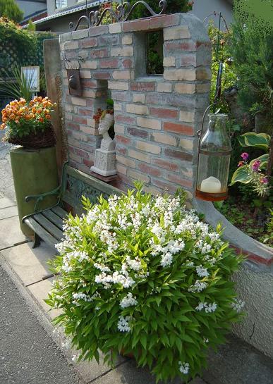 なんだ、かんだ言って、結局・・またレンガ積みをしていました。 昨日の場所・・・昨日の日記と比べてね(おヒマなら・・。)やっぱり、きちんと セメントを使って積んだほうがきれいね。 本当はもう 2.3段積んで、・・一番上の段は幅広にするつもりだったの・・・色々載せられるしセメントの在庫が無くなって、・・・ここでやめました。 それでも・・・まだレンガが余っているので、 ここに持ってきて、積みました。ここに積んで置くと・・いい色に苔むして来るし・・・使い道ができた時にここから持って行くので・・時々高さが変ります。ただ・・積み重ねるよりも 良いでしょ? 猫レンガはここで使いました。レンガの隙間で育った シンバラリアが広がっています。コルセウムアイビーとも言います。 バージニアストック が可愛い風景を作ってくれています。 背景のグリーンは・・ブロック塀にした時 ペイントしたのですが、グリーンにして良かったな・・・ブロックの色そのままの グレーだったら・・この景色も味気なかったと思う。 昨夜遅くにみた番組夜にも不思議な物語・・・面白かったな~。西田敏行 この人、近頃 いい味だしてますよね。昨日のはリストラされた、孤独な男が 娘夫婦に相手にもされず、ある日、知らない街 「三丁目の夕日」みたいな所に迷い込みちびまるこちゃんに出会う話・・なんとも・・・ぴったりと 収まっているじゃ~あ~りませんか♪ちびまるこちゃんのアニメにずっと、出演して欲しいくらいでしたよ。 私、時々思うのよね。うちのオッサンが時代劇に出るとしたら・・・賭場に出入りする・・ケチな野郎でさ、大もうけはするものの、・・結局、それを全部つぎ込んでしまうの、家に帰れば、やかましい尿簿(ちがう!) 女房が待っていて、「おまいさん・・・迷子になってたのかえ? ちと、遅すぎやしないかい?」ちくり、ちくり・・・と いびられるの、ま、べつに 時代劇に例える必要もないわな・・・カッカッカッ お宅のご主人様は・・・時代劇出演するとしたら・・・どんな役がピッタリかしら? 花ランキングの1位から4位までが接戦中です。・花ランキング 3位 -7873サイト中 └庭・花壇づくりランキング 1位 -387サイト中・総合ランキング 123位 -421315サイトお帰りに・・下のバナーを押していただけるとヒジョーーに!嬉しいです。 いつもありがとうございます♪