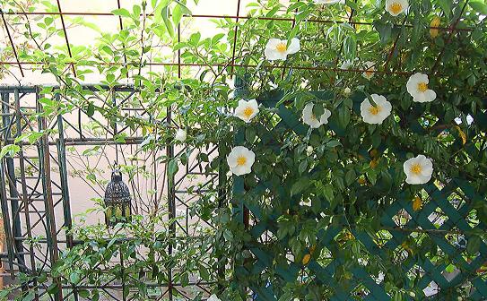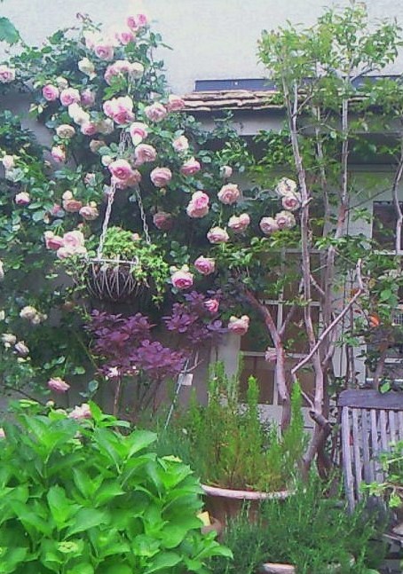 「若葉のささやき」天地真理 替え歌 若葉が庭に~♪ 急に萌えだした♪ある日私が~♪ 知らないうちに~♪小花・バラの事で今はこの胸が~♪いっぱいだから~、わからなかったの~♪緑は喜び~♪ それとも癒し~♪みーんなおんなじ事なのね~♪ 気がついたら・・・・庭が緑でいっぱいになっていました。なんか・・・うっそうとしてきました。 つい、一ヶ月前は・・・どんなだったかしら?ここもそう・・・ジャングルのようになっています。もどき小屋から見た景色 ねぇ・・・気がついた?今日から・・ブログのデザインを少し変えたの、左横の広告やら・・占い・アバターなどがなくなったでしょう?少しでも・・画像を大きく取り込むために・・・本文主体のデザインです。しばらくは・・これでいきますので・・よろしく って、・・画像デカ過ぎかなぁ・・ ?二階から見た・・・ガーデンカフェコーナー雨が降って、・・レンガがきれいになりました。その入り口です。 左側の・・・レオナルド・ダヴィンチ全部咲いたら・・・綺麗だろうなぁ~右側は・・ニオイバンマツリよ。上からは・・ブドウも下がってくるだろうし・・・ポールズヒマラヤンムスク のアーチを二階からパシャコッコちゃんが文句を言ってるように見えます。 100均の黄色いヒヨコちゃんはいずこへ~~・・・・一年間出しっぱなしまだまだ・・・載せたい画像はいっぱいあるけど・・・・一日の許容量を越えました ダトサ、 楽天のケチやっぱ、画像を大きくしたせいかな、 今の時期は・・・みんなも同じよね、色々な花が次から次に咲いてくれるから・・ネタが尽きない。 今日も掃除機で・・・モッコウバラの花枯を吸い取りました。もう・・散るだけだから、出力を強にして・・・バンバン吸い込む、吸い込む その、ビッフォー・アフター画像もあったのになぁ~。また、明日色々と載せます。こっちもお願い