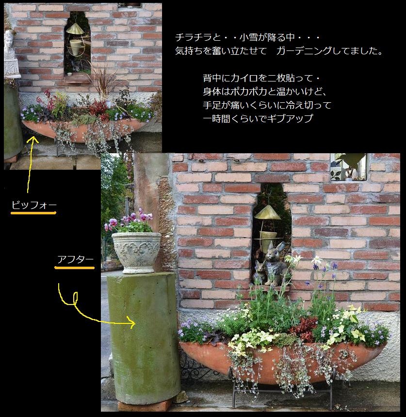 朝から雪が舞う 寒い日でした。モコの散歩は田んぼドックランハートの型がハッキリ出ているでしょう?♪なぜか、田んぼにサツマイモがいっぱい捨ててます。 夕方になって、急に沢山降り始めました。ヒメシャラの枝も・・・雪化粧で・・キュートに、 ほんの15分の間に・・ 雪が汚いものを隠してくれましたよ。 でも、今年は例年よりも寒いけど・・・まだ昨年の冬みたいな・・大雪は降っていないのよね。 コルジリネ・・雪で綺麗になりました。 ビオラ スカビオサ 皆さんは休日の食事の準備はどうしてますか?うちは・・オッサンがパチンコ屋さんに行ったら・・・いつ帰ってくるのかわからないので、お昼は作りません。ところが・・・昨日は・・早々と夕方4時前に帰って来て・・・「昼飯食ってないから・・今すぐ何か作ってくれ」ダト!!じゃぁ、インスタントラーメンでも・・肉とキャベツを炒めて、塩コショウを少々・・インスタント麺を入れて、仕上げにすりゴマたっぷりインスタントラーメンでもこうやると・・美味しくなります。 ほとんど・・食べ終わる頃に・・「なんか、このラーメンは味が薄いぞ!」「あら、水が多かった?でも、それだけ食べてて・・文句言わないでよ。」・・・・シュン。 夕方6時になってから・・口直しに・・回転寿司に行き二人で20皿食べました。私は5皿くらいです。たまには・・主婦も楽したいですもん。 朝はちゃんと作りましたよ。味噌汁・焼き魚・漬物・煮物台所の隅に・・昨日のラーメンの袋がそのまま。・・・その中に、ぬ、ぬ、ぬぁんと!!きのうのラーメン、 粉末スープを入れるの忘れてた!!味が薄いはずですワイなっ、でも、この事は・・・オッサンには言わない毎日来てくださる 3000人以上の人がこれを見て知っていてもそばに居るオッサンはその事実を知らないって・・ある意味・・・凄いと思う by悪妻オッサンはブログを書いてるのはしってるけど・・内容には全く興味がないんです。 そうそう・・インスタントラーメンですけど、私の大のお気に入りがあるんです。日清のラーメン屋さん旨味とんこつ5食パック 日清だけのしっかり製法 まっすぐ細めんに旨味のあるとんこつスープ。 このラーメン すっごく、美味しいんです。麺が縮れ面じゃなく、まっすぐの細めん出来上がりが・・インスタントっぽくなくて、好きです。 同じのが欲しくて、昨日スーパーで探したけど・・無かったよ。九州人はやっぱり、とんこつ味だよね。 土地によって、ラーメンの味って 全く違いますよね。皆さんの地域で これは美味しいぞ!!と思うラーメンを教えてくれませんか? 行く機会がありましたら・・味わってみたいもんです。 お帰りに下のバナーを押していただけると沢山の素敵なガーデンブログに出会えますよ。時々サボってますが どちらも 1位です。 みなさんの応援のおかけです。本当にいつもありがとうございまーーす♪