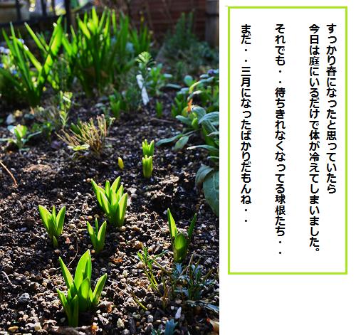 お天気は良いのですが・・・雲がちょっとでもかかると・・寒くてたまらない。そのたびに家に入ったり、晴れ間が出たら・・外に出たり・・ それでも、コツコツと土手ガーデンを頑張ってました。新しく広げた場所・・右側足を踏み入れやすいようにブロックで通路を作り・・花壇を二段にし、腐葉土・苦土石灰・鶏糞を入れました。そして入り口には・・両脇にバラを植える事にしましたよ。アーチも設置したいなぁ・・・ とってもいい香り 上品な姿のボレロ 今日・・自分んちにバラが何本あるか・・数えてみたら・・約45株、 ミニバラの場合は・・3本くらい一緒に植わっているので一株で数えたよ。 なのに!!バラに関しては・・いつまでたっても素人・無知最近 他の人のブログでも、花友達や園芸ショップの方からも「芽かき」と言う言葉が・・・自慢じゃないけど・・私、芽かきなんて、一度もやった事がない!どうだ、参ったか! ・・・自慢する所が違うダロ! 伸びた枝を切る事はあった、 それもテキトーに。 今日は芽かきも頑張ってみました。芽かきって・・量じゃないね、 いかに今まで・・何にもしてなかったかがわかるニャ、 去年植えた・・エンジのホリホック 虫がいっぱいついて咲かんかったんよ。今年は・・今の所 葉はきれい 今のうちに消毒をしたほうがいいのか?なるべく、クスリは使いたくないっちゃね~。 花友達は・・みんな手でつぶすって・・ ギョエェェー!春になると・・花も緑も元気になるけど・・虫も元気になる。 皆さんは虫は無視ですか? どうしてる? コボレダネからのクリスマスローズ出てくるのは・・この色ばっかり、 珍しい色とか・・白いのはちっとも出てこないよ。 ミニアイリス 今年初めて植えた球根だけど・・これは春のレギュラーに決定このまま、地面に残しておくのか、それとも球根を掘りあげたほうがいいのか? わからないことばかりです。知ってる方がいたら教えてクラサーイ。 お帰りに下のバナーを押していただけると沢山の素敵なガーデンブログに出会えますよ。 一日サボったら総合で54位です。 こちらは 総合で172位です。沢山の書き込みも楽しみに読ませていただいています。お返事も書けてないのに、本当にありがとうございます。今、ゆくはし植物園でガーデニングツアーを二件受付中です。 国際バラとガーデニングショー&noraの庭オープンガーデンツアー5月12・13日 これは私も行きます、御一緒しませんか?ゆくはし植物園主催 盛りだくさんの内容です。 花かごしま2011緑化フェア&フラワーパーク鹿児島・指宿温泉一泊4月14.15日 申し込み締め切りが3月28日ギリギリですこちらは一般の方の募集旅行になります。 くわしくは・・ゆくはし植物園 0930-24-1848まで・・受付時間午前10時より午後6時まで