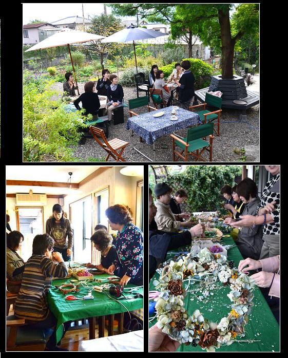 今日は私が所属するガーデニングクラブのツアーmimozaoba3さん のお世話でとても楽しい一日になりました。 ゆくはし植物園から2時間バスに乗ってmimozaoba3さん のハーブガーデンへ・・・広いハーブガーデンに手作りの工夫が満載でも、ここではリース作り体験があります。庭は後でゆっくりと見ていただきます。 人数が多いので 三箇所に別れて三人の先生に教えていただきました。面白い事に・・・三箇所ごとで 違う雰囲気のリースが出来てます。そして、始めは・・不安そうに始めた皆さん、 そのうち、面白くて仕方ないようで・・二時間があっという間 私は・・早目に終わって、皆さんのを見てまわったり、園内を一人で散策してました。ミモザさん手作りの・・ペンギンテラコッタがあったり、可愛い飾りつけがあったり・・本当に楽しいところです。足湯にも入ったよ~・・・後から身体全体がポカポカ※旦那様手作りの足湯があるんです♪ 早目に終わった人から・・ハーブティとハーブクッキィのおもてなし私が一番に頂きました。 美味しかったぁ~♪至れり、つくせりのおもてなし・・・いい時間を過ごさせていただいたよ~♪ ミモザガーデンには・・珍しい花も沢山、 名前聞いたけど、忘れた ・・・いつもの事、 これで4度目の訪問ですが・・・行く度に何か進化していて、ビックリします。 ここは・・レンガと「まさ王」で小道を作っていました。アーチは・・5月に一緒に行ったツアー 素適なnoraの庭レポート no.1 素適なnoraの庭レポート no.2この時、刺激を受けて、帰って来て作ったそうです。 優しい旦那様と・・がんばり屋のmimozaoba3さん の合作です。 一般の方が作ったお庭って・・ 本当に刺激を沢山頂きますよね。この後も、 手作り満載のお庭に行きましたが、私、いっぱい 刺激を受けました。それはまた、明日ね、 私が今日作ったリース、帰ってからすぐに部屋のドアに飾りました。 これを作ってて、思いました、30年以上 ガーデニングしてきて・・・今まで 咲かせて散らせるだけの繰り返し、こんなふうに ドライにして 生かす事を全くしてこなかったよ、 今日、一緒にリース作りを体験した皆さんも・・グルーガンを買って、リースを又作るんじゃないかしら24名が燃えたリース作りミモザさん、Oさん、亀屋スタイルさん、楽しいひと時を ありがとうございました。 明日はYさんのお庭と・・風の散歩道(ガーデン雑貨のお店)での戦利品の記事を載せますね。 いつも沢山の皆さんに来ていただき コメントも嬉しいです。お返事かけてませんけど、毎日楽しみに読ませていただいています。あなたのブログにも遊びに行かせてくださいね。ポチンよ~♪ポチっとね いつもありがとうございまーーす♪
