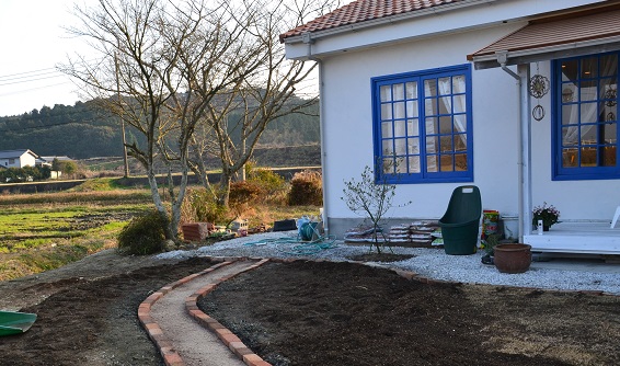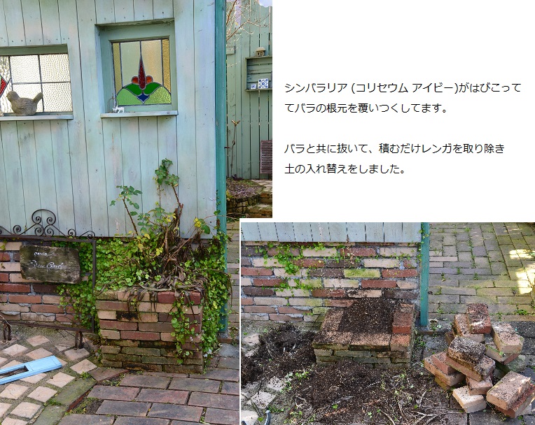 今日はとてもお天気が良かったので、朝からガーデニングを頑張るつもりでしたが、朝、オッサンを送り出してから、眠くて、眠くて・・・ 午前10時まで怖い夢を見るほど、爆睡してしまいました。トイレに行きたいのに、トイレの前に 黄緑の毒蛇が居たり、トイレに怖いお姉さんが居たり・・これは本当に怖かった。お化けって、やっばり女が一番怖い午後からやっと、動く気になりました。まずは玄関前から・・何もありませんが、耕そうと思ったら、何やら根が張ってて・・・固いレンガの色がイマイチ気に入らないもしかすると、普通のレンガに置き換えるかもしれない。春に向けての 庭の手入れは まだ始まったばかり、他の場所も土を入れ替えたり、耕したりの地味な作業が続く、土が固くなっていて宿根草などはかろうじて生きている状態、これを残すか、諦めるか、 いつも悩むよね。これが他人の庭だったら・・「もう捨てて、新しい苗を植えたほうがいいよ」と言うだろう。そうだよね、そのほうがいいよね。そう考えて、引っこ抜く、そうしたほうが思いっきり、土の改良、更新が出来るし、春の植物の育ちがぐっと良くなる。時々他人の目で自分の庭を見る事は大切ね、明日の木曜日は晴れ、その次の金曜日はくもり、その後は雨模様が続くどれだけ、庭作業が出来るかな。悪い夢を見ない程度に頑張るよ、皆さんの書き込みやポチ応援いつも本当に ありがとうございます。皆さんの言葉 嬉しく読ませていただいています。おねだりロッタ