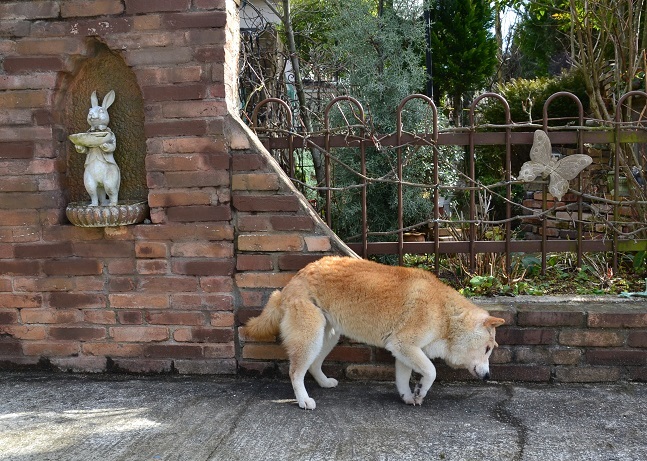 昨日は一日雨だったのでグータラ過ごし、今朝はピッカラキンの晴れなので、モコの散歩に行ってから、洗濯物を干したり、メリさんを外に出してあげたり、寝せておくと、半日以上飲まず食わずでそのままの状態だから「自然にまかせる」と消極的介護を宣言しておきながらなんとか元気にさせようとする、気まぐれ飼い主です。外に出してみると・・歩く、歩く 足取りがいい~ついでにオムツを外したら、気持ちいいのかすぐに排尿なんか・・嬉しそうな表情に見えるんだけど・・元気のいい頃よりも部屋の中に入れてから、表情が豊かに見えるのは 自己満足かしら?やっぱり、いつもそばに居て 可愛がってると違うのかもね二年前 いつもムッとした表情だった・・ それも可愛いけどね。hidepon さん チワワのチーちゃんがお☆様になってしまったのですね。チワワって、身体が小さいためか 具合が悪くなると突然逝ってしまう場合があるだから高齢のワンちゃんと言っても、心の準備が出来ないままお別れなので後悔と哀しみと寂しさとで・・どうにかなりそうな位、苦しい わかります。私も 元気だった頃や亡くなった日を思い出して 今でも涙が出てきます。火葬せず、土手ガーデンに居ますが 庭の手入れをしながらいつも話しかけてるの。「忘れないからね」「お母さんの事みててね」いつも独り言を言ってます。でもね、あんなに可愛がってたワンコ達ですが・・亡くなった時はすごく苦しいけど古いワンちゃんの事から哀しみを忘れて行くのよね・・いい思い出だけが残る。今まで7匹見送りました・・まだヒメとロッタの事は哀しく思い出しますが、メリさんのお世話やガーデニングで 前を向いて歩いてます。一昨年の夏に首が傾いた時のロッタどうなるかと思ったけど、この時は3週間で元に戻って安心したよさて、午後からは土手ガーデンの雑草抜き&土づくりに励みました。雑草ばかりが元気な土手ガーデン、綺麗にするの大変な作業です。依頼の庭にこの土を持って行きます花の土だけでは、フカフカ過ぎて背の高い植物が植えられませんから・・我が家にも依頼の庭にも一石二鳥の土手ガーデンの手入れです。少しの場所しか手入れが出来なかったけど、雑草の根っこが大量に出た、これじゃあ いくら花苗を植えても育たないはずだわ、※鉢の中にワンコが居るわけでは無いよ・・その近くに花を植えただけ耕した場所にはクリーピングタイムを植える予定まずは腐葉土と堆肥いれね、作業をしている間、ジョウビタキが周りをチッチッチッと舌打ちしてしてる。きっと、掘った後のミミズを早く捕りたいのよねちょっとカメラを取りに行ってもどったら もう居ました。遠くから写した画像をトリミングして見たら・・振り向いて見てる。今日も来て下さってありがとうね~♪ピョコっとな~♪