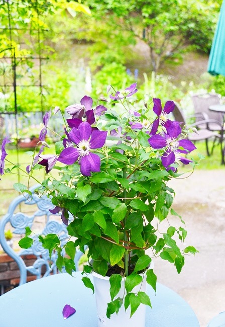 一昨日、大分から買って来たクレマチス、鉢植えのままでは味気ないので、あんどん仕立てを慎重にほどいた・・ポキッと行きそうな細い枝・・三本の枝があれこれ絡んで、知恵の輪のようだった。折らないように 神経を使ったので、肩が凝ったよ。まだ 蕾が沢山あるので、しばらく楽しめます。そして、花後に剪定を早めにして、種を作らないようにすると、四季咲きの場合ですが 40日~50日で二番花が見られます。種類によりますが、花より 2~3節下を剪定します。居間から見える、板壁とアジサイ左上のコニファーがダメになってるので切り倒さなきゃ・・それから・・ステージの鉢植えもやりかえなきゃ・・画像アップ時に気づいてる・・コニファーガーデンコニファーって、ある日突然 ダメになる時が来る、なんでやろ?意外と可愛い ミムラス冷涼地では初夏から初秋まで咲き続けるらしいが、たぶん九州では・・夏の蒸れでダメになるのではと思う。始めのうちはカットして分岐を促す事にしよう。そして、カットした枝は花や蕾を取り除き、挿し木してみた。発根するといいな。娘から一日早い 誕生プレゼントをもらった。孫ちゃんの手から・・「トントン・・ドウジョ!」私、トントンって言われてるのつい、この間 母の日プレゼントをもらったばかりなのに・・誕生日プレゼントは初めてかも・・嬉し💛どこに置こうかと庭をウロウロ・・・部屋じゃ無くって、庭ね。取りあえず、ここに置くけど 落ちないように底に接着剤で固定する。そのうち、この天使のためにレンガを積むかも・・ナナはうちに来て、丁度一か月になります。今朝も・・油断してたら オッサンのおかずを盗られました。お弁当のおかずに入れた 残りのヒレカツです。オッサンに言うと「そうか、ナナが食ったか💛」と嬉しそう。文字通り・・真綿に包むように大切にしています。この2.3日 朝晩は冷え込みますからね。来た当時 2.35キロだった体重がっしりと重くなったから・・3キロにはなってると思ったけど、2.55キロ 200グラムしか増えてなかった。毎日、少なくとも3回は散歩してるから・・増えないのね。下のバナーを押して下さると、素敵なガーデニングサイトに出会えますよ。コメント・・お返事かけてませんけど、楽しみに読ませて頂いてます。いつもありがとうございます。さっそく バナーになった。