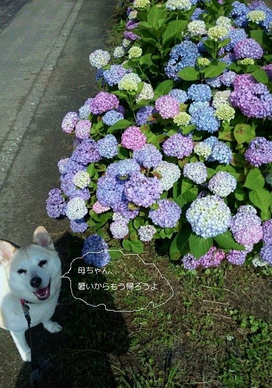 今日は何故か一眼レフは使わなかった。モコとの散歩で携帯画像はあるよ。今の携帯画像は・・ひと昔前のデジカメよりも綺麗に写るよね。昔は画素数も少なったから大伸ばしは出来なかった。散歩道の横に植えられたアジサイ・・・本当は私の胸位の高さだけど、向うの住宅が写らないように アングルを下げて写した。本当はモコとナナを一緒に散歩したいけど、モコがナナにちょっかいをかけて、ナナが「ガウ!」っと怒るモコは弱虫だから 怒られると・・引き下がるんだけど、まだ慣れてないから・・もしも、モコが反撃したらと思うと一人で二匹はまだ怖い。夕方はオッサンと二人でそれぞれ一匹ずつリードで散歩してる。芝生の土と種を蒔いて・・二週間 ようやく柔らかい新芽が上がって来た、千鳥格子のタイルと芝生裏庭のフォーカルポイントになってると・・自我自讃 フロントガーデン 緑でうっそうとしてきた。梅雨に入る前に刈り込みたいなぁ・・昨日のコメントで、私と同じように・・足の火照りがある人が沢山いましたね。安心しました。 安心していいのかわからないけと色々な更年期の症状があるけど、周りの理解が無いと辛いですよね。身体がだるくて、午前中いっぱいは頭が上がらない人もいるだろうし、知人に色々と聞きますが・・家族に症状を訴えても「どうせ更年期症状だろ」と まともに聞いてくれず、「どうせ更年期症状・・」この言葉一つで簡単に片づけられてますます、行き場の無い思いにかられる。 悪循環ですよ。子育てを終わって・・目の前に手のかかる夫はいるけど、もうね、自分の事だけ考えたらいいよ。少々、家の中が散らかったっていいじゃない。夫婦が同じように年をとるのに、どうして女だけが、一生・・家事・炊事・世間のお付き合いをしなくちゃならないの。私は・・昔から 手抜きばかりしてる。グータラ主婦だから精神的に追い込まれる事はあまりないと思うけど、真面目な主婦の方には・・手抜きをお勧めするわよ、気楽にゆる~い家事で・・更年期をやり過ごしましょうね。一度しかない一生・・どう彩るかは自分次第よ~楽しい事を見つけましょう。ガーデニングエンザにかかるのもいいよ~♪おねだりロッタ 時々登場します お返事かけてないけど、コメント楽しみに読ませて頂いてます。