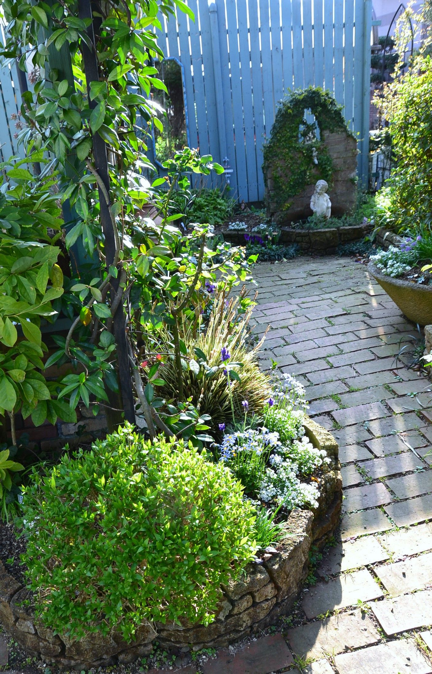 雨の予報でしたが、お湿り程度の雨しか降ってません。だから昨日植え付けた苗に、たっぷりの水を与えました。これから10日近く☀マークが続いています。一気に春になりそうですな。ムスカリもチューリップも小ぶりなまま スラっと伸びたチューリップだったら もう少し華やかな風景になってただろうな。今年はアリッサムが茂る前にチューリップが咲き始めたのでイマイチこれからに期待する事にしよう。ユーフォルビアの花穂が上がって来た無事に冬を乗り越えて これからもっと大きくなります。枯れ枯れの土手ガーデンの木々に少しずつ新芽が出て来てる。土手ガーデンに階段をつけつつ・・草を取り グラス系の植物を植えこんでいます。ただ、急こう配なので 土が転がって下の花壇の花に落ちて行く。なんとかしないと・・それと一番左の画像の場所 お隣との境なんだけど、木柵が朽ちて倒れそうになってるの、ここもなんとかしないと今度はレンガを積もうかと思案中・・・YouTubeを見てたらピピッとくるのがあった。停止させて撮影・・こんなん してみたいなぁ・・レンガが300個以上いるだろうな。これくらいの高さになると、鉄筋を入れないと危ないだろうな。YouTubeを見てると・・楽しくて時間があっと過ぎる庭つくりのヒントがいっぱいあるYouTube ガーデニングコーヒーでも飲みながら画面を最大にして見てね💛テレビを見てるよりもずっと素敵な時間を過ごせますよ。今年も小道ガーデンを勿忘草でいっぱいにしたくてアチコチで固まって育っていた苗を掘り上げて均一に植えました。ブルーのニゲラも合間に植えて・・どんな景色になるやらブルーの柵が前後してズレてたので 綺麗に横並びにしました。それにしても・・借景だったカイヅカイブキが無くなって 空ばかりだなブルーハウスに昇ってるモッコウバラに蕾がついてます。咲くのはまで一か月先 それまで葉が茂ってくれるでしょう。プルモナリアの白が咲き始めました。濃いブルーのプルモナリアがいつの間にか消えてしまったよ。毎年小道ガーデンで一番に咲いてくれてたのに・・また植えなくてはプルモナリア ‘ダイアナクレア’プルモナリア ‘オパール’一度植えたら 毎年株を広げながら咲いてくれます。花友さんが去年の11月だったか 挿し木をして下さってた薔薇スノーグース レイニーブルー ストロベリーアイス新芽が出てるって事は・・もう鉢に植えてもいいよね。嬉しいナッ♪あーーーーー! する事が多すぎて どれも中途半端になってる!ノートに書いて、その中からピックアップし 付箋紙に書き目の前に貼って 一つずつ片づけて行かなくちゃ 何も進まないね。皆さんのお庭にも春は来てますか?今年はどんなお庭にしたいですか?考えるだけでもワクワクしますね。いつも嬉しいコメントをありがとうございます。 とてもありがたいですし 皆さんに助けて頂いています。これからも私の井戸端会議に参加して 日々の徒然を残して行って下さいね。皆さんの応援ポチが 励みになっています良かったなと思った方、応援してね。