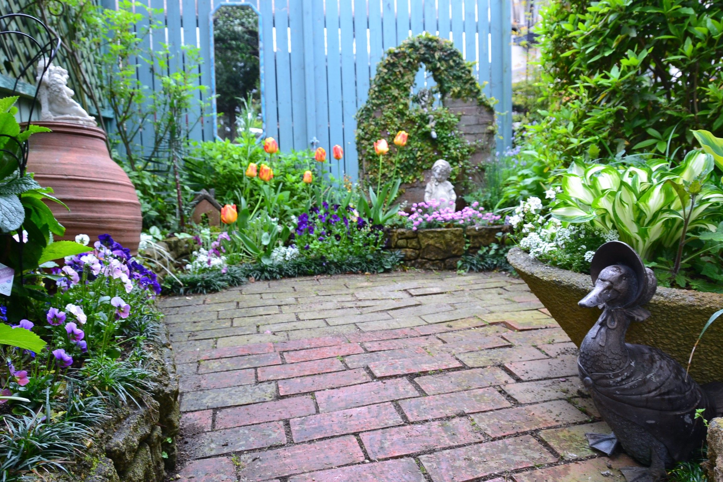 午後から雨の予報でしたが、中々降りそうにないので再び フロントガーデンの草取りをしてました。スマホにイヤホンをつけて・・何やら聞きながらの作業ホント、集中できますね。途中でオッサンに声をかけられたり、宅配便が来ても声が聞こえなくて、ごめんなさいでした。このコーナーの雑草が残っていたので仕上げしました。レンガ敷きが波うってるのは・・周りに植えたコニファーの根っこが持ち上げたためです・・去年、少しレンガを外して根っこを切り取りました。でも・・ガタガタ 30年以上前に 母からもらった タカネエビネ ここには沢山植えていたのですが、ほとんど消えて 残っているのはこれだけ消えてしまわないうちに掘り上げて 場所を変えてあげようと思います。昔、エビネブームがあって、母は田舎の山々を探し歩いて集めてました。私の今の年齢位だったと思う 元気だったな。女神像の周りもジャングル状態だったので 久しぶりに スッキリなったわ。左奥には クレマチスの小輪 ピンク色になるのが昇ってます。壺の周りは斑入り葉のセリ セリ 斑入り フラミンゴ 3号ポット苗一度植えたら 翌年から 放置しててもアチコチから出て来ます。痩せた土地・半日陰でも 大丈夫他の植物との取り合わせで もっと素敵になるはずなんですが・・(´・ω・`)どなたかが、レンガを敷きますって書いてましたね。レンガを敷いた時に・・固まる土を兼用するといいですよ。全く雑草が生えないですから ぜひおすすめです。庭にレンガを敷いたのは 2004年の6月~7月でした。16年前の画像二か月かけて、800枚以上を敷き詰めたのですが、並べて・・レンガの隙間に土を掃きこむの 繰り返し作業これが今のフロントガーデンの基礎になりました。このころは・・固まる土を知らなくて 普通の土を隙間に入れたのよ。この隙間に雑草が生えるようになって・・本当に大変です。後でオッサンに「固まる土を入れ込めばいい」って言われましたが一からやり直す元気はありません 若くないから身体を壊します。草取りも楽しいって 思えるから 良しとしましょう。2008年5月の画像ですが右のほうにバークベンチを置いてましたが この場所は現在こうなってます。庭全体にレンガを敷き詰めるのは大変ですが、畳半分位の場所だったら 半日あれば出来ますよ。周りのレンガは積むだけでもいいし♪草花ばかりの庭もいいけど、ひとつこんなコーナーがあったら椅子一つ 小さなテーブル一つ置いてみませんか?こんな記事を つらつらと書いてたら このコロナタイムの間に レンガ積みしたくなりました。あ・でも不要不急な用事はダメなんだよね。やっぱり この間レンガとセメント買っておけばよかったよ。みなさんも私の井戸端会議に参加して 日々の徒然を残して行って下さいね。 何でもいいのよ~♪ 愚痴でもぼやきでも 嬉しかった事でもね。良かったら ポチっと応援よろしくお願いします