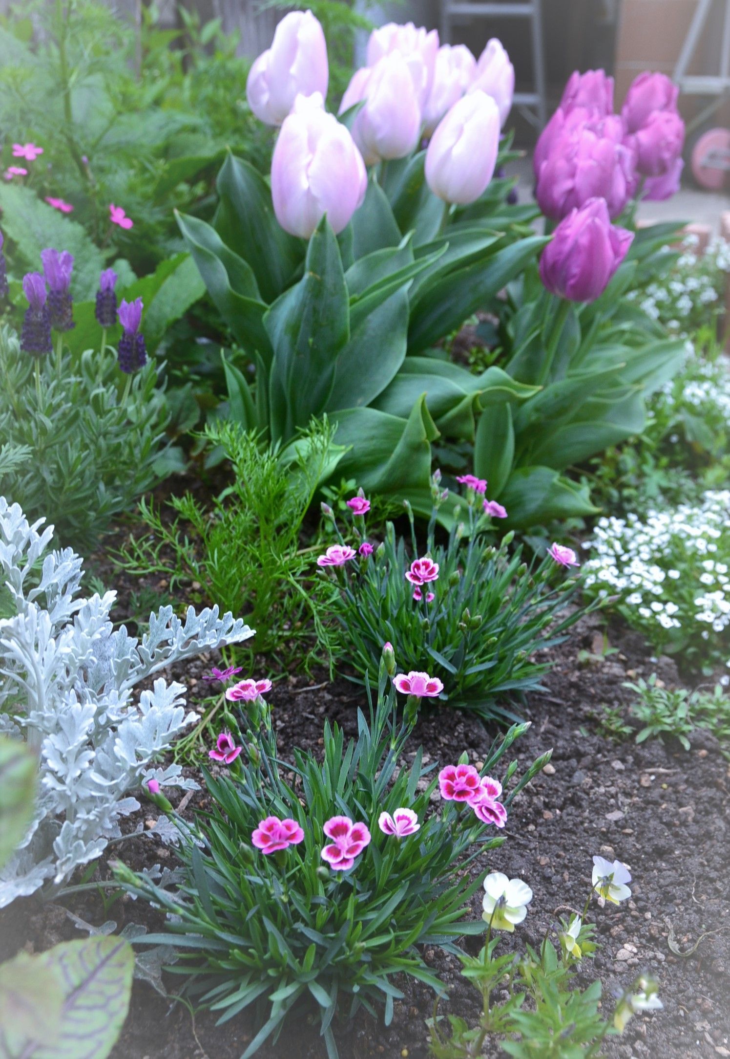 桜が葉桜になって、風が吹くたびにひらひらと舞い散ります。こういう風情もまた いいものですね。吉野桜を二本 八重桜を一本植えたのは10年以上前 もう一本の吉野桜は枯れ 八重桜は辛うじて生きてるけど小さい今年から日当たりが良くなったのですぐに大きくなるでしょう。ジャカランダの木も大きくなって土手の背景になってくれるといいな。いい加減なもので ネットでこの木を取り寄せて、中々植え場所が決まらなくてとりあえず、プラ鉢のまま 借り植えして3.4年放置してたから大きくならないし、花も全く咲きませんでした。今度は大きくなるでしょう、今日みたら新芽が出てました。木の周りをレンガで囲み 腐葉土と肥料入れてセラスチュームコットンを植えました。花に水をやりつつ・・ジャカランダにも肥料と水が行き渡るって事ね。ジャカランダが大きくなれば ブルーハウスの背景になって かなり面白い景色になると思うのです。小道ガーデンはこれから大変化していきます。何故なら、勿忘草とアガパンサス花でブルーがいっぱいになるから。あ、それにエキウムカンディカンスのブルーもある。それから、それから・・ヒメウツギの白やモッコウバラも咲くぞー♪少し咲き始めています。今年はちょっと早いかもクルマバソウが満開です チューリップ🌷はもう終わりかけだけど、クルマバソウと相性がいいのでしばらくはこのまま楽しみます。ブロ友さんに頂いた種だけど、庭のアチコチで花を咲かせてくれてますよ。この花からまた種を採り 全国へ飛んで行きます。アラビス スプリングチャーム土手ガーデンに植えたこの花 よーく見ると、豆のような種をつけてる。割と丈夫で育てやすい ピンクの小花は可愛いし💛 種採り決定!フロントガーデンはずっと放置気味でしたが気候が良くなって 去年の秋に植えた花がまた元気を取り戻してモリモリツルコザクラ(ピンクの小花)がコボレ種から育って助かりました。これが無かったら 味気なかったと思う。最近 土手ガーデンばかりに力を入れてるから そろそろ こちらにも手を入れないとコロナによる自粛生活のおかげで 庭が綺麗に変化してます。みなさんも頑張ってますかーー♪テレビを消して ベランダや庭で楽しむ事も出来ますよ人に逢わなきゃいいんだから 花と会話してればいいんだから退屈なんかしてられない。人生は思うよりも短いよ。ついこの間まで20代だと思ってたのにもう60代も終わりに近いいつも嬉しいコメントをありがとうございます。そして、知らない事・アドバイスなど 沢山助けられています。みなさんも私の井戸端会議に参加して 日々の徒然を残して行って下さいね。 今日も良かったな、参考になったなと思われたらポチっと応援してね。人気ブログランキング