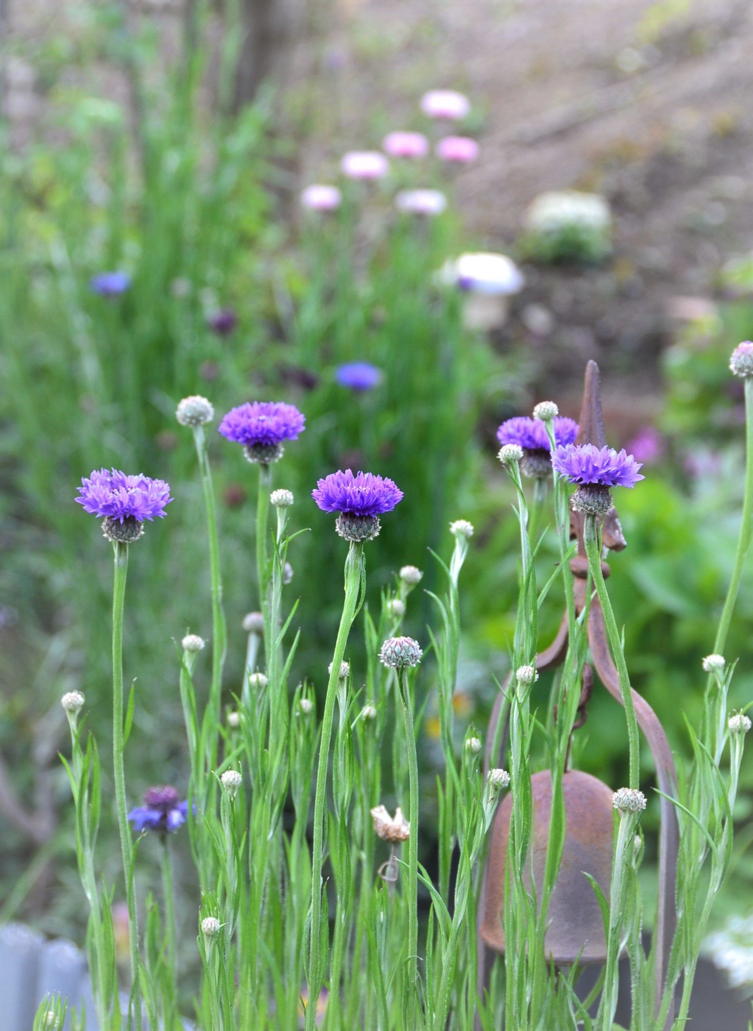 毎日数人の方が簡単レシピを書いて下さってとても助かります。今日は むぎほさんのレシピで 鶏と筍の唐揚げをしました。オッサンはいつも料理の途中で手を出してつまみ食いをするのですが、今日も 口に入れて「ん!」 これはなんだ?筍よ、というとビックリしてました。美味しかったみたいで 食事の時もパクパク食べてたよ。下ゆでしてたから、そんなに長く揚げなかったけど、次回はカリッとなるようによく揚げようと思いました。他のレシピもみんな試してみたいと思います。それから筍の保存ですが、我が家では二通りの処理で保存してます。一つは 茹でて、水気を切り冷凍するだけ 去年のを一年後の昨日食べたけど別に何てこと無く、普通に 美味しい煮物を作れましたよ。二つ目は下ゆでしたものを縦に切って 天日に干したり、ストーブの前で乾燥させたりしてカリカリにしてからジップロックに入れて保存します。使う時は水でもどして使うのですがコリンとした食感になって・・とても美味しくなります。今の時期はいただき物のタケノコが続きますが色々なお料理で利用したり、保存して味わいたいですね。ヤグルマギク背の高い植物は、すぐに倒れてしまいますが、今年はまだ大丈夫ね、添え木になるものをそばに置いてるからかしら?でも、その添え木も太い支柱を使って白いビニール紐などでくくったりしたら・・ダメーーー! 見た目がダサい!私はなるべく細い支柱を使い、それも植物の影になるようにしてます。括り付ける紐も・・緑色に着色された麻紐か緑の結束バンドを使っていますよ。※こういう倒れ易い草花は風にそよぐから美しいと思うの細い支柱だったら 草花と一緒にそよいでくれますよ。ジキタリスなど茎の太いのはそれと同じ位の支柱を後ろに隠すように添えてます。アーチの向こうに ブルーの椅子を置いてみました。元々の色は何色だったか忘れる位色々と塗り替えて来ました。今はこの色で落ち着いてます。だって、庭にポツンとこの色があると ピッタリおさまるんです。2010年の6月にキフツゲートガーデンを訪れた時 この椅子の色に一目ぼれしました。「世界で一番美しい村に住む人々」でもコッツウォルズが特集されてましたよね。この画像、この椅子の説明で何度も載せてる位お気に入りです。それから、庭の依頼を受けた時も・・そこにある椅子を水色に塗りましたよ。そして、この庭にはアナベルが似合うと思い この一年前に植え 間違いは無かった。ガーデニング素材を 庭の飾りと思えば 色を塗りたくなりますね。ただし、どれもこれも塗ったり、雑貨が多すぎると ダメかも。どなたかのコメントにアーチの耐用年数の事が書かれてましたが、こればっかりは・・当たり・はずれがあって 値段よりも国産で選んだほうがいいと思います。maidinChinaは本当にダメ! 見た目が良くても、2.3年でダメになります。バークベンチなどは・・上から塗料がいっぱい使っているからわからなかったけど、鉄筋のはずなのに、グサグサに崩れて すぐにベンチとしては使えなくなりました。今は・・モッコウバラを絡ませてますが、それも崩れかけてます。去年の今頃のバークベンチ なんとか補強しなくては。アーチは鉄製の丈夫な物を選んだほうが長持ちします。これは、行橋植物園で安く売ってもらって二基買いました。もう10年以上なりますが 最近 三角屋根が外れて物干し竿で補強しました。 見える?アイアンメッシュの錆がひどくて~。とコメントがありましたがあれは表面だけなので、大丈夫ですよ。使い始めは 手にそのサビ色が着きますが、そのうち 自然になじんだ色になりますから、というか・・その鉄の素材がいいと思うのですが変にペンキなど塗ると・・かえって庭の景色の中で浮くと思います。我が家では沢山使ってますが そのままですよ。クレマチスが絡んだり、朝顔が絡んだり、モッコウバラも絡ませてますが 全く気になりません。ここにも使ってるのわかる?これからツルバラが絡んで行く予定です。ここにも少しアイアンメッシュを使ってクレマチスを絡ませつつあります。このクレマチス、去年ブロ友さんに小さな苗を頂いて 今年はもうこんなに育って 初めて花が咲きます。明日にも咲きそうなんだけど、どんな色が咲くのやらとても楽しみです。10時から記事を書き始めて もう午前1時を過ぎました。過去記事を参照にしながら書いてたら、思わず読みふけっちゃってこんな時間までかかってしまいました。寝ます、皆さんも自粛生活で 退屈だと思いますが何でもいい、日々の徒然を書き残して行ってね。井戸端ブログですから~ん♪ 引き続き おすすめの 簡単な料理など 書いて下さると助かるわよ。 毎日 献立考えるのがメンドクサイもん 教えてね~。良かったら ポチっと応援よろしくお願いします