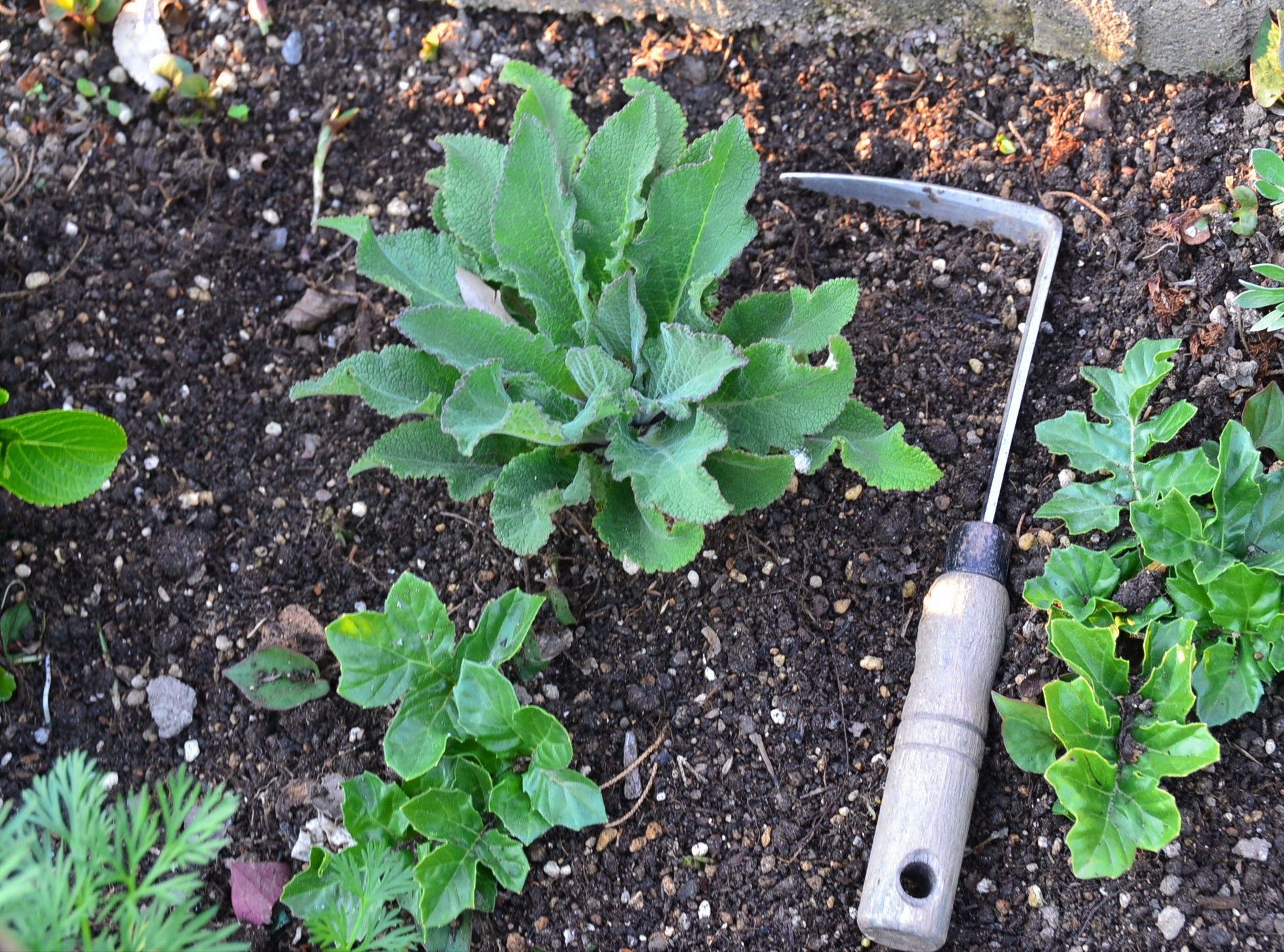 2年目のジキタリス これも外側の葉を摘み取り、根っこをほぐします。
