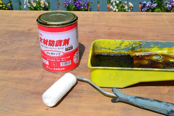 サンドペーパーで磨いてから 防腐剤を塗りました。私の仕事はここまで・・