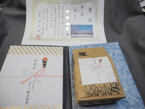 5日に予定されていた山焼きが13日にずれたのですが、またもやなんだか天気がよろしくないとの事で、今年は無しになるかも知れません。日曜日に行なわれた写真コンテストの表彰状と賞品です。受賞者の中では私が最年少でして高齢化を象徴するような元気な高齢者ばかりでした。ま・佳作に滑り込めたのも列車がやってきたわずか前から青空が出てくれたお陰でして、この写真はツキの産物に他なりません。ともあれ二匹目を狙って又1年過ごしながらツキに出会える事を楽しみにします。