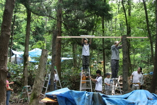 今回も1日目晴れ、2日目大雨のキャンプでした。1日目が晴れたので、良かったです。いろいろやりたいことがあったのですが、「ジャブロー建設計画」(屋根付き広場)を最優先事項とし、みんなで建設してきました。先日建立した柱に基準線を出し、高さを決めていきます。水平器を使って算出しました。まったくもって適当なやり方です。でも、けっこういい感じ。梁になる木の皮をめくっています。みんな、何の作業をしているのかよく分からない状態の中、私の怒号で進んでいきます。梁(はり)の運搬。8500ミリの1本ものの梁をみんなで運搬しています。けっこう重いです。梁を柱に乗せる。せ~の!ひょい!と、あっさり乗せました。(うそ)梁の位置を合わせ、固定していきます。高い位置での作業もこなしていきます。建設開始から3時間。なかなかいい感じになってきました。震える足で屋根の上に上り、どんどん作っていきます。いい感じでしょ?梁のしなりに合わせて屋根もしなっているの。これがまたいい味を出しているんですよね~。屋根を張り、照明をつけて完成。5時間くらいでできた。ま、柱とかは前に作っていたから、早くできたんですけどね。これで雨が降っても大丈夫。ジャブロー建設完了!ちなみに、廃材やその辺にある木を使っているので、安くできました。そうね~・・・2万円くらいかしら。夕食準備にかかります。今夜はなんだか豪華そう・・・。そんなわけで、ビビンバ丼(私のために辛さ控えめ)中華スープキュウリの浅漬けマカロニのケチャップ煮(私の大好物で、私のリクエスト)作り方は副長が教えるけど、実際に作るのはスカウト。がんばって作ってくれたので、とても美味しかったです!!次は何をリクエストしようかな~。みんなで美味しく頂いちゃいました~。でも、みんな少食なのよね~。ホタル狩りにも行きました。昨年はほとんどいなかったけど、今年はちらりほらりといました。なんとなく増えている感じでした。この調子で、私達のホタルの里にも来てくれるといいんだけどな~。ホタルは少なかったんですけど、こいつが出てきました。夏はまだなのに。きっと越冬したやつですね。そのまま離してやりました。子供達に見つかるなよ~~。そんなわけで、怒濤の1日目が終了しました。屋根はできたけど、つかれた~~~~。
