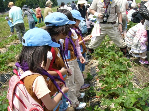 今日はイチゴ狩りに出かけました。青空の下イチゴ畑につくと、イチゴがいっぱい。どれから食べるか悩んでいるのかと思ったら、洗わないといやだとごねる女子スカウト。それに比べ男子スカウトは黙々と選んでいます。ほら、こんなでかいのみつけた(^^♪うめぇ~~♪リーダーも並んで負けずに食べてます。ああ美味しかった、イチゴの命をいただきありがとうございました _(_^_)_