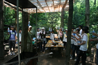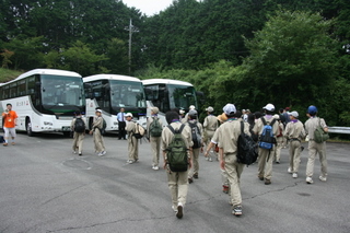今日で最後です。午前中に引き上げて帰ります。11時には完了しました。11時半には、箱根の里を出発しました。最後に、お世話になったキャンプサイトに、感謝の「弥栄」を送っている所です。バスの中は、大騒ぎしたり、爆睡したりを繰り返しながら、にぎやかに帰ってきました。帰りの途中、「村の駅」に寄ったり、朝霧高原(次回の日本ジャンボリー会場)を勝手に下見(車窓から)したり、樹海の中でコンパス確認したり、富士五湖見たり、高速道路最高地点を通ったり、諏訪湖見たり、乗鞍の入り口に行ったり、上高地の入り口見たり、安房峠をくぐったり、平湯温泉に入ったり、クマ牧場を見たりしながら帰ってきました。最後の解散式で無事終了。21:45頃でした。終わった・・・。夏が終わった・・・。でも、資材の片づけなど、事後処理はもう少し続きます。