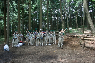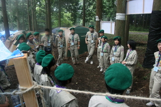 朝3時頃には、富士川SAに到着。時間調整後、出発しました。現地にはちょっと早めに入れてもらい、眠い目をこすりながら設営開始です。先に現地入りしていた団委員長のお出迎え。徒歩でサイトへ。ここから一番奥のサイトまで歩いていきました。下りでしかも急坂、けっこう遠かったです。いろいろ考えると、かなりブルーな気持ちになりました。ちなみに、サイトマップです。左下の方にあるんですけど・・・。設営中は、鬼神のごとく動いて、指示を出していたので、写真は無し。いつの間にか完成していました。テント10張り、食堂+キッチン+本部用タープ、野営門・・・単独団としては最大級の規模でした。夕食も各班で炊事を行いました。キャンプ慣れしているので、ケンカしながらも実にスムーズでした。夕食後は、開会式。かなり堅苦しい開会式でありました。BVS,CSにはかなり酷だったと思います。これは、各隊隊旗の入場です。どこかにうちの代表スカウトと隊旗があるんですけど・・・。本願寺派で2番目にえらい「総裁様(新門様)」のご挨拶です。知らない言葉や風習、規律がたくさんあるようで、かなり驚きました。この言葉も初めて聞いたし・・・。このお方、連日宿泊されたようで、それもすごい偉業なのだとか。代表スカウトの記念撮影。よく頑張りました!これで1日目は終了。さすがに疲れたのか、スカウトはそうそうに寝静まりました。涼しいのと、風が流れるのとで、かなり過ごしやすかったです。明日は、富士山5合目までのバス遠足です。