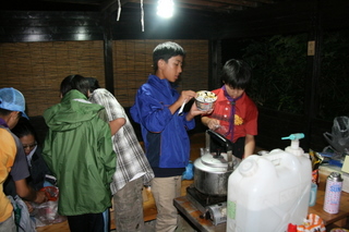 今日は、朝から場外プログラムの富士山5合目ツアーへ行きました。お弁当も手作りと言うことで、朝早くから、朝食用のご飯、おにぎり用のご飯を2回に分けて炊きました。バスに乗って出発です。新五合目だったかな?目的地は。またまたバスの中は大盛り上がり。宴会仕様のバスだったので、なおさらです。自慢の弁当完全版。5合目での記念写真。5合目にしてこの景色、さすが富士山です。そして、山頂も見ることが出来ました。近く見えるけれど、6時間はかかるそうです。帰りは、2時間も駐車場で待つことになりました。日陰無し。いつ来るか分からないバスを、待ち続けました。帰りは、京都のCS隊を三島市内で降ろしたりといろいろあって、2時間半遅れで帰りました。そんなわけで、トラックでサイトまで送ってくれました。スカウトは大はしゃぎ。サイトについてすぐに夕食を作り、夜のイベント「夜店祭り」に行くことになりました。夕食は、焼き肉と焼きそば。すごいボリュームでした。当団の演し物は、水鉄砲射的でした。ちょっと遅れていったので、短い時間でしたが、スカウト達は楽しかったようです。これで2日目終了。長い一日でした。明日は、場内でいろいろなプログラムに挑戦です。