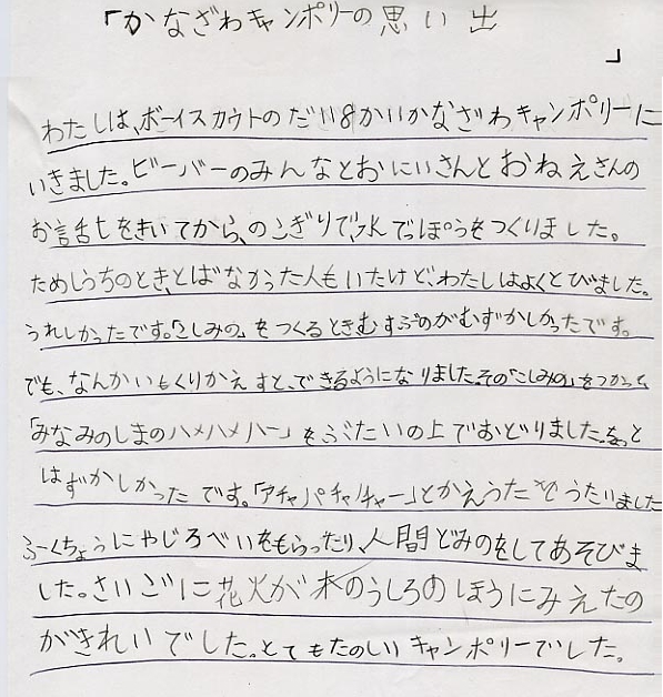 【第8回金沢地区キャンポリー】ボーイ、ベンチャー隊は静岡の第5回本願寺はスカウトキャンポリーに行っていますが、ビーバー隊は金沢地区キャンポリーに参加しました。金沢市内のビーバー、カブスカウトとガールスカウトが集まりお祭りの開会式の始まりです。今日は何をするのかなぁ。昼食を食べた後はビーバーの集いの始まりです。約100名のスカウトとリーダーの大きな輪で始まります。今日のプログラムはまずは竹で作る水鉄砲作りです。16に分かれて違う団のスカウトとチームを作ります。まずは材料の竹を切ります。もちろん自分の分は自分で切ります。ピストン部分にはスキマテープを貼り布を巻いてピストン部分は完成。さて、水は勢いよく飛ぶかな?もしもし?自分に水掛けてどうするの(笑)水鉄砲ができたらみんなで「あたま星人おしり星人」で鬼ごっこジャンケン負けたら勝った人の股の下を通って後に並ぶジャンケン列車で大盛り上がり。夕ご飯の前に夜の大集会のビーバの出し物の腰ミノを作って準備万OK夕焼けが紅く空を染める頃いよいよ夜の大集会の始まりです。ビーバー隊は「アチャパチャノーチャ」と「ハメハメハ大王」の唄と踊りを披露しました。CS隊やBS隊、奉仕隊、ガールスカウトなどの唄や踊り、パフォーマンスにもノリノリで声援を送っていました。おかげで大集会が終わってもテンションアゲアゲのスカウトたちこんばんは興奮して寝れないかも(^_^;)【追記】スカウトのふーちゃんから感想文が届きました♪ずいぶん楽しかったようですね。