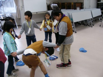 あけましておめでとうございます。今日は金沢第2団、第11団と6団の合同のビーバー新年会でした。スカウトが34名に兄弟や保護者、リーダーを含め66名が集まりました。チームを作りいくつかゲームをして点数をつけていきます。ゲームごとにチームのメンバーが変わるので、個人の得点もバラバラになります。まずは手をつないだ輪で1つのロープの輪をぐるりと一周するゲーム。意外とみんな協力してすんなり出来ていましたね。次は、駒を作りチーム代表が回っている時間をきそうゲームそのほかじゃんけんをして勝ったら関所を通過でき、全員が関所を通過するゲームやくじ引き案山子になって目をつぶり30秒クリアーするゲームなどみんなで楽しみました。ゲーム終了後2団さんが作ってくれたぜんざいをいただ来ました。最高得点は11団のスカウトで198点でした。最後はみんなにお年玉の福袋がもらえました。たくさんのスカウトたちと楽しくもりあがり、楽しかったですね。