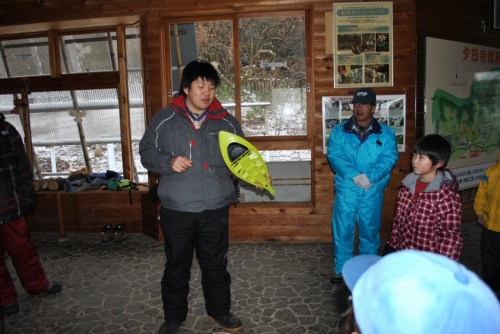「あらみち」を行くというとどんなところ?って感じですよね。「あらみち」とは金沢弁で”誰も踏みしめていない雪道”です。誰も歩いていない雪道をあるくにはこれですよね。みんな知ってる、これはみどりの「木の葉」です。違うよ、スノーシューっていうんだよ。これを履いて雪の上を歩くんだよ。じゃあ、これは何だ?1. ぞうり2.わらじ3. かんじきそう、3かんじき、みんな正解です。では、履いてみよう。ここで、ロープワークが出てきましたね。ビーバーでは始めてかもしれませんが、しっかりしばってね。今朝方から降った雪が積もったので外に出て歩いてみるとう~~ん、雪が少なくて、便利なんだか、どうだか・・・・まあ、里山をひと回りしてみよう。一生懸命見ているけど、何を見つけたのかな?どうも木に顔があったようですよ。今度はスノーシューもはいてみました。やはり雪が少なすぎて、便利なのか、どうなんだか最後は隊長と雪合戦をして、隊長に雪玉をぶつけて遊びました。今度は雪がたっぷりあるときに履いてみたいですね。きーふくちょう