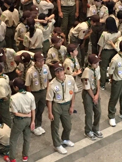 今日は早朝から手旗訓練で始まり、ヘロヘロになって1日が終わりました。気温が下がらない猛暑の朝。朝5時から手旗をがんばっております。朝礼。ちゃんと制服です。すでに炎天下。リーダーが積み込みにいっている間に、野営門の完成をお願いしました。毎回ジャンボリーに行く時は、資材をコンテナに積み込んで運んでもらいます。9時半スタートと聞いていったのに、9時の段階で積み込みが開始されていました。これで積み込みきれなかったら、ケンカになるところでしたが、余裕を持って入ることができたので、よかったです。いやはや、それにしても入るのか?と、みんな思うのでありました。うちの荷物の少なさに、ちょっと驚かれる。そして、不安になる。だいじょうぶだいじょうぶ(^^)こっち側は余裕なんだよね。でも、違うチームなので、ダメなんだよね。帰ってきたら、かわいい班旗もできていた。ミヤマクワガタも捕まえていた。なんかいい風景だな~。冷やしうどんでした!暑い時にピッタリ(^^)完食目指してがんばろう!しっかり食べれば、夏バテ、熱中症にも勝てる!しかし!最後の使いの6玉は余計だったな。閉会式。やることはやった。心残りは、トートラインヒッチという、ロープ結びをさせ忘れたこと。班旗立てられるかしら・・・。笑顔で帰ってきました。暑くて死にそうだったけど、夏の思い出がまた出来ました。さ、ジャンボリーをがんばろう!