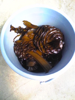 ここに来てから三回目のワカメ~全体像は無理でしたが、二つ繋いだらだいたいのカタチ。さっと湯通ししました。洗ってると、ワレカラが沢山面白いのでイチゴの空きパックにいれてみました~もっといたのですが、パックひっくり返してしまって減ってしまいました旦那さんに、悪趣味といわれそう~