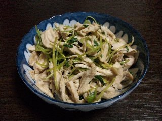 鶏ささみをレンジでチンして糸三ツ葉と合わせて、さらに三ツ葉がしなっとなるようにチンして出し醤油とワサビを合わせたのであえました。