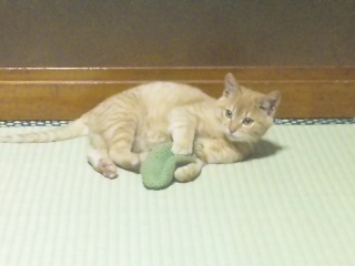 今夜はまだ茶の間でアクリルタワシで遊んでます♪