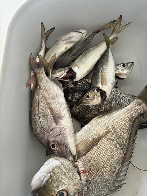 おはようございます(^^)/里帰りの話を中断して、お盆の話です。1日目。次女の彼氏家族と一緒に長崎へ。この日お母さんは夜勤で不参加。5人で竿出しなので安全なポイントへ。陽が落ちる前の遊びでベラが釣れましたがリリース。後でこのベラが美味しいから今後持って帰ってと。ま~4人の子供達、トラブルばかりやしスマホで遊んでるし・・・こりゃ~頑張らんと食いもん無いぞと密かに頑張ります。向こうのお父さんと二人で頑張って。1日目の釣果!アジは35クラス6枚、ヘダイが45クラス1枚、チヌ40クラス1枚、真鯛35クラス2枚でした。帰り際にお母さんから「明日は私と付き合ってと」と頼まれ、連続釣行決定。一度自宅へ帰り、次の日は彼氏君と3人で同じポイントへ。陽が落ちてお母さんにヘダイがヒット!その後、精霊流しと諫早かな?花火大会が始まると当たりも無し。早めに納竿です。そしてお魚パーティ。親3人で料理横で見ていたら・・・この量が1食で・・・・いや~凄いですね食べ盛り4人組、食べる食べる・・・完食です。その後。この釣りが気に入られたご両親、我が家で仕掛けの練習です。僕もうれしい、今後が楽しみです(^^)