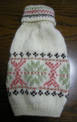 皆さんは、犬派?猫派?私は、どちらかというと、猫派です。(生き物は、昆虫以外は比較的、抵抗ないです。)猫の方が、散歩に行かなくてもいいし、自由気ままに生きてる感じが、なんとなく好き。さて・・・今日一日、頑張りました~~不気味な物体!!(壷ではありません・・・)裏側は・・・もう、分かっちゃったかなぁ~~手頃なモデルが居なかったので、ネズミのチュウ太君に着てもらいました。なんか、変!!ポーズを変えてもう一枚。ちょっとは「らしく」見えます?!最近、ドッグウェアの編み方が増えてる?!手編み大好き!(’08ー’09)'07~'08にも載っていましたね。サイズだけ、参考にしました。いつもの事ながら、ドッグウェアをどうしても編んでみたくなりました。といっても、家には犬はいません・・・前にストラップをあげた、黒のトイプーMIX君にあげるつもりです。「あげる」というよりも、無理やり「押し付け」ちゃいます。結構、犬のお洋服は高いらしく・・・どうせなら、クリスマスっぽくしてあげたら、ちょっとは喜んでもらえるかしら?!な~んて・・・久しぶりに「一目ゴム編み止め」をしました。うろ覚えなので、本をひっぱりだし、いい復習になりました~~メインの使用糸は毛糸と手おり糸のメーカーです。さんの「NEWパステルウール」オフホワイトもう、売ってないです・・・ご訪問ありがとうございます。励みになりますのでポチっとして頂けたら嬉しいです。