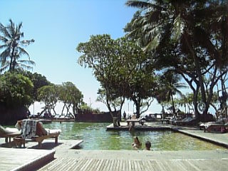 バリハイアットに泊まっておりました。私のお気にいりのホテルであります♪ 古いのですが庭がきれいで、ビーチからの海風がプールサイドを吹き抜けてとても涼しいです。ホテルはもちろんビーチフロントにあり、砂浜手前は芝生なのでお子さんを遊ばせるのにも、ゆっくり植物を見ながら散歩するのにもやさしいホテルです。ハイアットの会員制度ゴールドパスポート会員は☆モーニングコーヒーサービス、☆SPA AT BALI HYATTでのジャグジー&サウナ利用無料、☆バリハイアットロゴ商品15%割引、☆フィットネスセンター利用無料があります。さらにプラチナ会員(年間ハイアット系ホテルに5滞在以上の会員)には☆インターネット接続無料☆アフンタヌーンティールームサービス(飲み物だけのサービス)があります。