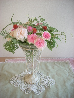 昨日、バラ友さんが、「お庭のバラが咲いたから・・・・。」とシャンテ ロゼ ミサトを、持ってきてくださいました。いつもお世話になっているので、先日、お庭のお手伝いをさせて頂きました。そのとき小さな蕾だったお花を持ってきてくださいました。ミントと合わせた小さな花束とっても嬉しかったです。お庭のブルーサルビアと一緒に生けました。 大切にされて育った、可愛いミサト。ピンクのお花がとても綺麗です。 欲しいバラが、また一つ増えてしまいました。バラ苗 シャンテロゼミサト 国産苗 大苗6号鉢 四季咲き大輪 ピンク系 フレンチローズ(デ...価格:3,465円(税込、送料別) 今日もポチッとお願いします いつも応援ありがとうございます