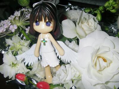 「カレンダーには載らない大切な日♪」となった、友人のとっても素敵な結婚式でした。思わずちょっと泣いちゃったりしました。涙腺弱いもので(苦笑)。職場結婚なので、同僚の人達からは絶大なお祝いをされていました。おかげでふたりの姫抱っこ写真が撮れてラッキー(笑)。本当に心からお祝いさせていただきました。二人の仲がいつまでも続きますように・・・vv会場からいただいてきた花と一緒に撮影。葵、天使仕様ですvv