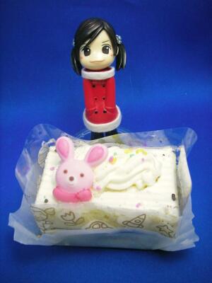 昨夜、外出先から帰ってきた弟が珍しくおみやげを持ってきてくれました。普段遠出をしても、家族におみやげなど買って来ることなんてないのでちょっとびっくり。おみやげの中身は小さなバタークリームケーキでした。今時バタークリームなんて珍しいなぁ・・・と思いながらもおいしくいただきました。ちなみにわたしが一番好きなケーキは最もオーソドックスな苺のショートケーキです。生クリームと苺の組み合わせ、最高(笑)。毎年家族で食べるクリスマスケーキは私が買っているので、いつも定番の苺ケーキになります。たまには別の物を買うのもいいかなー・・・と思いつつ、最終的にはそれになってしまいます。でも今年は他所で買ってもらえるらしいので、どんなケーキがくるのか楽しみです。苺ケーキだったとしても大歓迎ですけどね(笑)。母はわたしがケーキを買わないかわりに電気ポット「とく子さん」を買って~♪と、おねだりしてきました。・・・何故?!(笑)こんなにかわいいうさちゃん付きケーキでした。