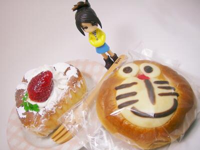 会社帰り、何故か急にあんぱんが食べたくなったので馴染みのパン屋さんに寄ってみました。しかし、残念な事にあんぱんは売り切れていました。いつも必ず2~3個は残っているのに、こういう時に限って無いのは何故でしょう(涙)その代わり、ドラえもんとアンパンマンの顔を模したクリームパンが大量に残っていたので、今回はドラえもんを選んでみました。そして見た目が鮮やかなケーキパンというのも購入。三角の形をしたパンの上に、生クリームといちごが乗っていてその上に粉砂糖がトッピングされ、何とも美味しそうvさっそく帰ってからお茶と一緒に、ケーキパンをいただきました。すると、中にはカスタードクリーム!てっきり生クリームが入っていると思ったのに!うわー騙されたー(笑)まぁ、美味しかったから別にいいか☆そんな訳で、今日のおやつも明日のおやつもクリームパンに決定です。