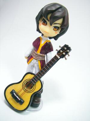 ようやく今までの改造パーツと、ガレキの色付けをする事ができました!昼食と晩御飯の間、おやつも食べずにずーっと色塗り。さすがに精神力が切れたので、スーツガレキの組み立ては明日にしようと思います。とりあえず改造パーツ&ガレキに加え、色が剥げていたパーツや前回色塗りに失敗した分もあわせて・・・10種類ほど色塗りしましたよ。我ながら量、多すぎ!疲れるはずです(呆)おかげで色々完成させる事ができましたので、これから折を見てちょくちょく画像を載せていきたいと思います。そんな訳で本日はファンタジー衣装2種。吟遊詩人衣装と盗賊衣装です。それぞれキャラクターも作っているのですが、そちらはイベント展示限定の為、陸と海に着てもらいました。本当はリュートを持たせたかったのですが、まだ作っていないので代わりにミニチュアギターです。写真で撮ってみたら、何となくメリハリが無い感じなので、ズボンの色でも変えようかと思いました☆盗賊は動きやすい服が鉄則なので、出来るだけシンプルにしてみたら・・・シンプル過ぎな感じ(汗)