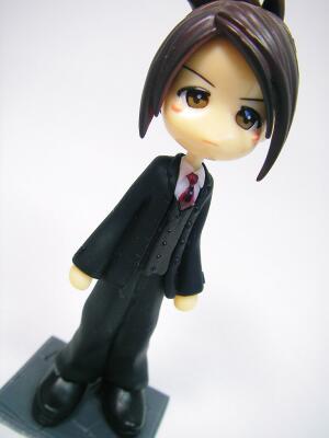 ガレージキットスーツ、完成しました!写真だとわかり難いのですが、靴のみ光沢トップコートを吹き付けて、革靴っぽくしてみました。インナー3種のうち、色を塗ったのはネクタイver.のみ。ネクタイの色はワイン色にしてみましたよ。赤だとブレザーっぽいし、黒だと物足りない。ピンクだとちょっと甘い感じになっちゃうしー・・・と迷った挙句、ワイン色ですよ。塗料が思ったより緩くて、色を乗せた時ちょっと滲んでしまいましたが、結構お気に入りです。他2種(ハイネック&シャツ)は下手に色を付けない方が凛々しくて良いと思ったので、白下地のままです。タイトスカートでもはかせてみようと思いましたが思った以上にスーツの裾が狭かったので、結局この組み合わせのみになりそうです。うーん、ちょっぴり残念☆まぁ、このままでも大満足ですけどね♪