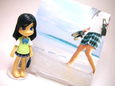 本日4月18日はRAG FAIRの新曲「夏風便り/ココロ予報」とオクリモノライブDVD発売日・・・という事で、今日はCMさせていただきます(笑)改めてCDで夏風便りとココロ予報を聞いてみると、やっぱりココロ予報の方が好みですねぇ。まずタイトルにやられました☆そう、ココロですよ!真っ先にココロの事が頭に浮かびました。残念ながら歌詞は男性の一人称ですが、サウンドがすごくココロっぽい明るいリズミカルな曲なのです♪朝のニュース番組「ズームイン!SUPER」「ズームイン!サタデー」のお天気コーナーにて、歌詞無しver.がBGMとして流れているのでよかったらちょっと聞いてみてくださいvあ、もちろん夏風便りも好きですよ!後半の部分ですか、『ホラネゆらり消えてゆく・・・』の後のコーラスが思わず鳥肌立つほど堪らなく感じるのです!きっと生で聞いたらもっと堪らないだろうなぁ・・・。ううう、22日の武道館が今から楽しみです!オクリモノDVD、すぐに見てしまうのもちょっともったいないので次の休日まで見るのをガマンする事にします。楽しみ~♪せっかくなのでジャケットの女子高生と同じ感じの制服着せたココロで撮影♪そしてこちらがオクリモノライブDVD。ノーカットなので、RAGのMCを聞いてみたい!という方は是非☆