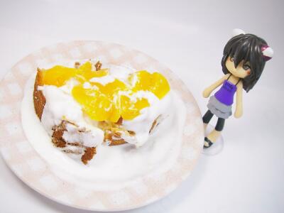ワンフェス行きたかったけど、今日も作業日です(泣)まぁ、頑張ったおかげで結構進みましたけどね。その作業の息抜きに、ちょっとしたお菓子作りをしてみました。・・・といっても、昨日妹が作っていたケーキの余り物を、組み合わせただけですが(笑)市販のスポンジケーキに切れ目を入れ、妹がホイップした生クリームと、妹が切った黄桃の缶詰を挟もうとしたらなんと!ホイップした生クリームが暑さの為、みるみる解けていくではありませんかっ!!・・・これを見たら、ちゃんとした形で作る気はなくなったのでわざと皿の上で崩して、なんちゃってトワイフル風にしてみました(笑)まぁ、見た目はともかく、味はおいしかったですよ。そんな訳で、真夏にショートケーキは作るものではないという事をひしひしと実感してしまいました★ちなみに妹も同じようにクリームが雪崩になってしまったそうです。・・・人様にあげるケーキだったのにね(苦笑)
