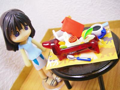 昨日の「おとぎの国~」と一緒に買った食玩「ダックス店長のコーヒー屋さん」リーメントの動物店長シリーズ(で、いいのかな?)という事で今回は犬、しかもダックスフント中心(笑)みたいです。前回のイタリアンは猫モチーフだったので、思わず箱買いしてしまいましたが、今回は理性が勝って2箱のみ購入。今日の写真はそのうちのひとつ「ほろにがエスプレッソとアラモード」です。骨型クッキーも付いてきましたが、そのまま並べるのも何なので、犬小屋モチーフの箱(?)に入れてみましたよ。犬型グラスも良い感じだけど、アラモードのプリンの肉球模様もすごく可愛い!周りの果物もリアルでおいしそうです。今更ですが、食玩はどんどんと細かくリアルになっていますね。お腹が空いている時に見ると、うっかり口の中に入れたくなっちゃいます(笑)