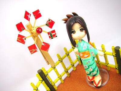 8月に突入したので、さっそくTOP写真を更新しました。ようやく梅雨明け宣言が出た訳ですが、そうなると一気に蒸し暑くなるんですよね(汗)今までが涼しかったので、暑さに慣れないうちは体調に気をつけないと!そういえばようやく浴衣リペイントが出荷したようですね!手元に届くのはちょっと先になりそうですが、それでも夏のうちに発売されただけ、良いと思います☆さて、浴衣といえば、先日作った浴衣ガレキにほんのちょっとだけ手を加えてみました。・・・といっても、濃い緑の波線模様をネイルシールを避けて書き込んだだけですけどね(汗)ほんの少しだけ、鮮やかになったような気がします。アクセントって大事なんですねー。そんな訳で、先日行った佐原土産の赤い風車と一緒に撮影してみました♪