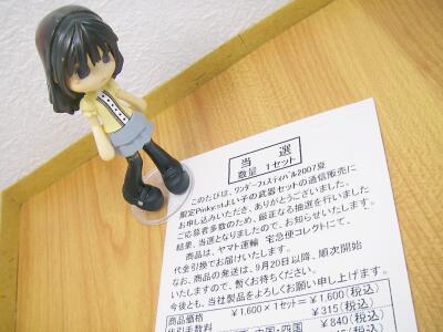 2007年ワンフェス限定の「よい子の武器セット」通信販売当選しましたーvわーいわーい♪20日から順次発送という事なので、お金を用意しつつわくわくしながら楽しみに待とうと思います。うふふ。話は変わりますが、本日は土曜出勤でした。DoCoMoショップに行きたかったし、5時からRAGのネット生放送があったので、半日だけ出て帰る予定でした。ところがいきなり会社が、土曜出勤した人全員分の昼食を用意してくれたのです。半日しか仕事しなかったのに、お昼をもらって帰るのは良心の呵責に耐えられないので、結局3時まで仕事してきました。・・・え?もしかしてこれが狙い?(笑)まぁ、今日の用事には間に合ったからいいのですが。そんな訳で、昨日の予告通りDoCoMoショップに行ってきました。すぐに電池の量が減るのは、電池パックの膨張の為だそうです。その膨らみで接触不良になりどんどん電池の無くなるスピードが早くなるらしい。そしてその膨らみの原因は、充電しながら携帯を操作したからですって!なるほど。ものすごく覚えがあります(笑)充電したまま、某ムービー見まくっていたからなぁ。ううう、これから気をつける事にします。そしてその膨らんだ電池パックですが、何と無料で交換してくれました♪ありがとうドコモ!これでまた1年は機種変更しなくて済むよ!!