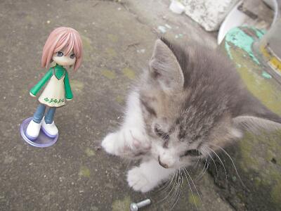ようやく外が明るい時間に、外のにゃんことご対面☆もうそろそろミルクだけじゃ足りないだろうと思い、離乳食を用意してみました(・・・といっても、空ちゃんのドライフードを水にふやかしただけの物ですが)作ったごはんと、デジカメを持って庭に出たら、さっそく自分の住処からにゃんこが飛び出して来ましたよ!ううう、可愛い~vさっそく離乳食を差し出してみたら、あっという間に完食。やっぱりもう、ミルクだけじゃ足りなかったみたいです。考えてみればあんなりっぱな歯が生えているのだから、当然といえば当然ですが。そんな訳で、しばし戯れタイムを満喫していたら、何やら家の中から熱い視線・・・。うわ、空ちゃんが見てるっっ!あまりにもじっと見ているので、仕方なく家に入ったら空ちゃんがわたしをストーキングしてきましたよ(笑)どこに行っても、空が僕に付いて来る♪(byココロ予報)うーん、本当にやきもち焼きですな☆この調子だと、まだまだ2匹は仲良しにはなれそうにありませんね(汗)あーあ・・・。ところで未だに仔猫の名前が決まっていないので、わたしが勝手に付けてしまうかと考え中。さて、どうしようかなー?