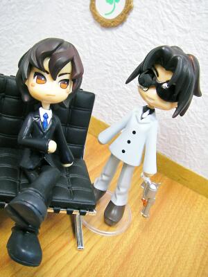昨日に続き、今日も暑い自分の部屋に引き篭り。あまりにも暑かったので、逃亡策として午前中に昼寝などしてしまいました(笑)その昼寝のせいか、何となく元気になって(笑)やたらいろんな事を進める事ができました☆適度な昼寝は、体調を整えられるって本当なんですね!そんな訳で、ピンキー改造もちょっとやってみました。今回はガンダムマーカーを使ったプチリペイント。あまりにも細かい改造なので、見せられるのは写真のサングラスくらいです(汗)前からやりたかったイービルのサングラスリペイント。デフォルトのまま装着させると、目がでかくなって笑っちゃうだけですが、真っ黒にリペイントするとそれなりにカッコよくなる事に気付きました!よ、よかった。これがやりたくてわざわざイービルを二人購入したのですよ!せっかくなので、スーツと組み合わせてみました。でも、もう少し待てば武器セットのゴツイ銃を持たせる事が出来たのになぁ。惜しい!ちょっと早まっちゃいましたね☆