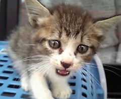 昨日の日記の最期にちょこっと書きましたが、月曜日の夜我が家の庭に突然小さな来訪者。それはまだ手の平に乗るくらいの、仔猫でした。ものすごく人懐っこくて元気な子なので、多分どこかで飼っていたのだと思います。捨て猫か迷い猫かは、まだ分かりませんが(捨て猫の可能性の方が大きい)妹や母親の様子を見ていると庭で飼うみたいな感じです。本当は家の中に入れてあげたいのですが、ご存知の通り家にはすでに空ちゃんという大きな猫がいるのですよ!空ちゃんはオス、そしてその仔猫もオスなので相性は最悪。実際対面させてみたら、とんでもない事になったので(ショックでまだ詳しくは書けません・涙)たぶんゲージ越しでも仲良くなれる可能性は低いでしょう。何はともあれ、近いうちに病院に連れて行って健康診断してもらいたいと思います。ちなみに1枚目の写真が来訪者の仔猫で、2枚目が我が家の王子様(笑)の空ちゃんです。