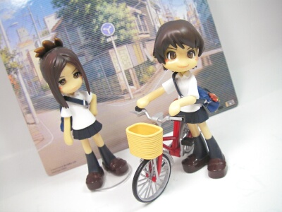 時をかける少女通学路バージョンが届きました♪待ちに待った甲斐あって、こちらもすごく出来が良いです♪何と言っても注目は赤い自転車!めちゃくちゃ可愛いですvしかも各部分がすごくリアル☆タイヤが回ります!ペダルも回ります!スタンドを下ろせばちゃんと自立します!(コツいるけど)うーん、こんなに出来が良いのならリペイント用にもうひとつ注文しておけばよかったなぁ・・・。正に後悔先に立たず、ですね。あーあ。ところで3番目の写真、バッグにさり気なくエアギア・アギトピンキーのバックルを付けてみました。バッジみたいでカッコいいですね♪少年ピンキー用の通学用バッグにどうでしょう?